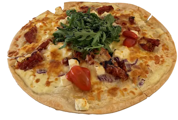 Mit Crème fraîche, halbgetrockneten Tomaten, Hirtenkäse, roten Zwiebeln & frischem Basilikum