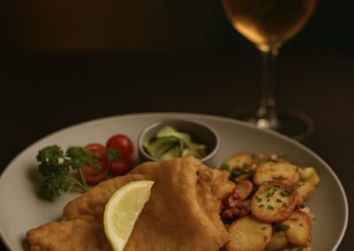 8,50 €Knusprig gebacken, mit Kartoffelpüree oder Pommes – auf Wunsch mit Ketchup oder Mayo