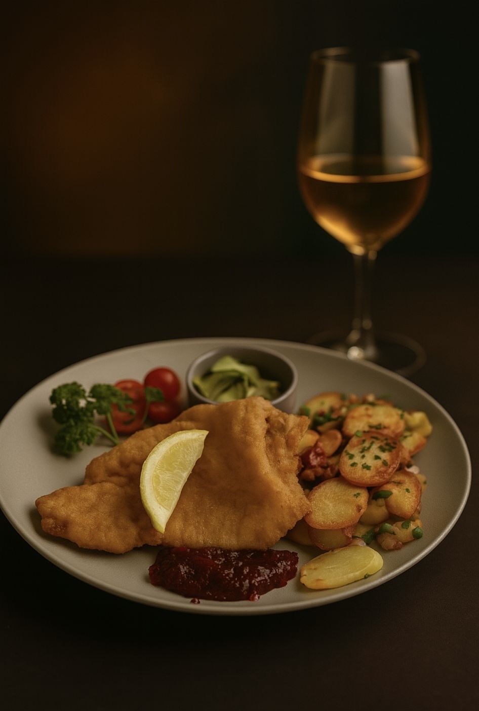 23,90 €vom Kalb, Goldgelb paniert, serviert mit Bratkartoffeln-Gurkensalat und Preiselbeeren