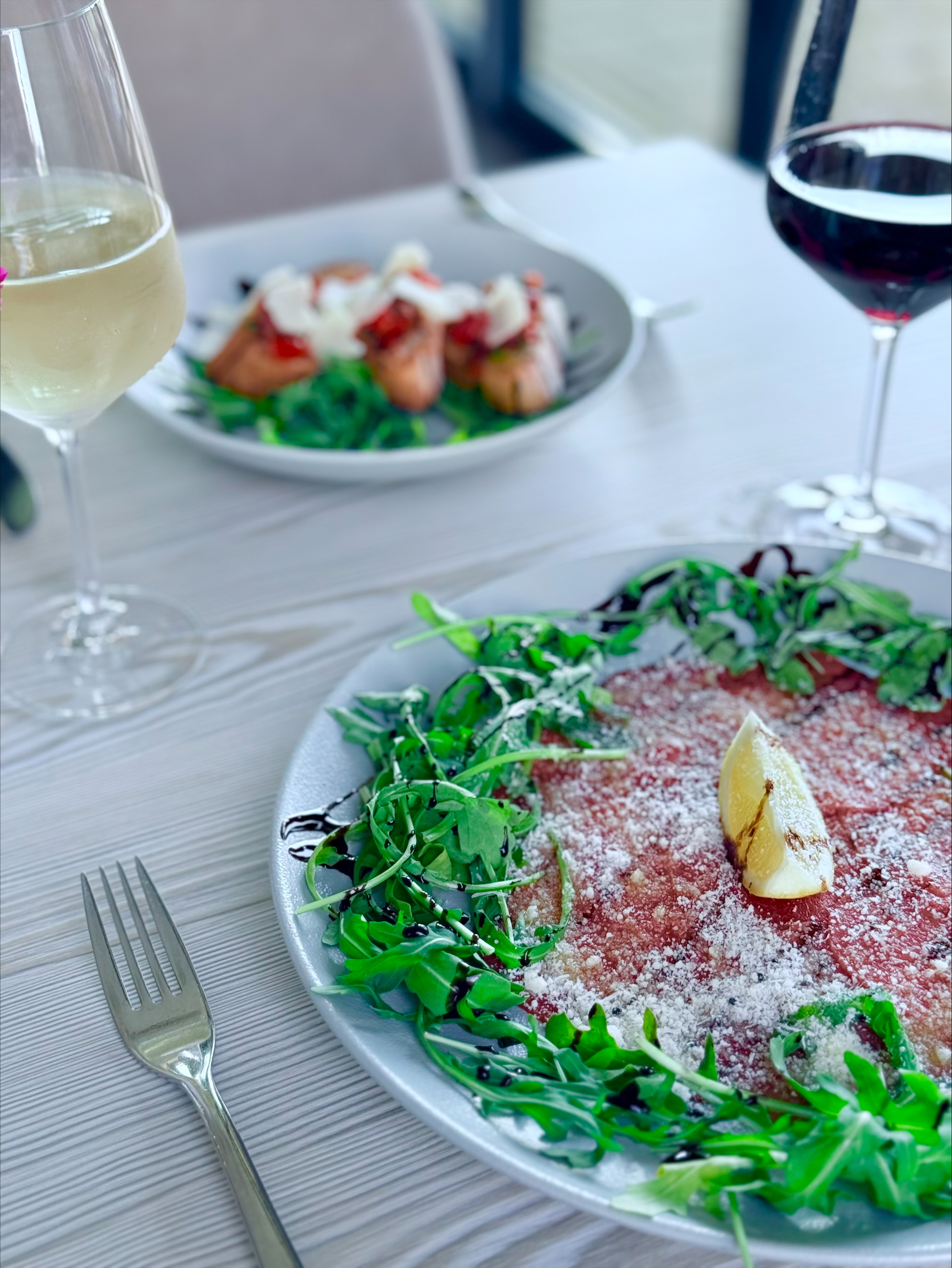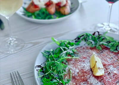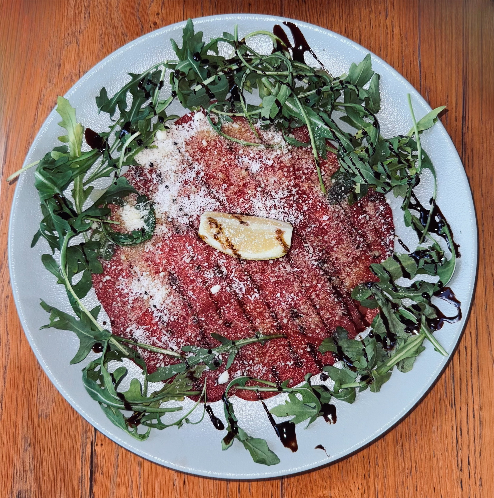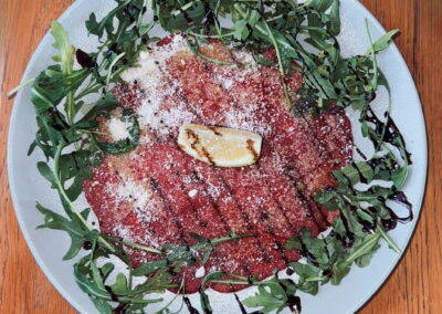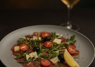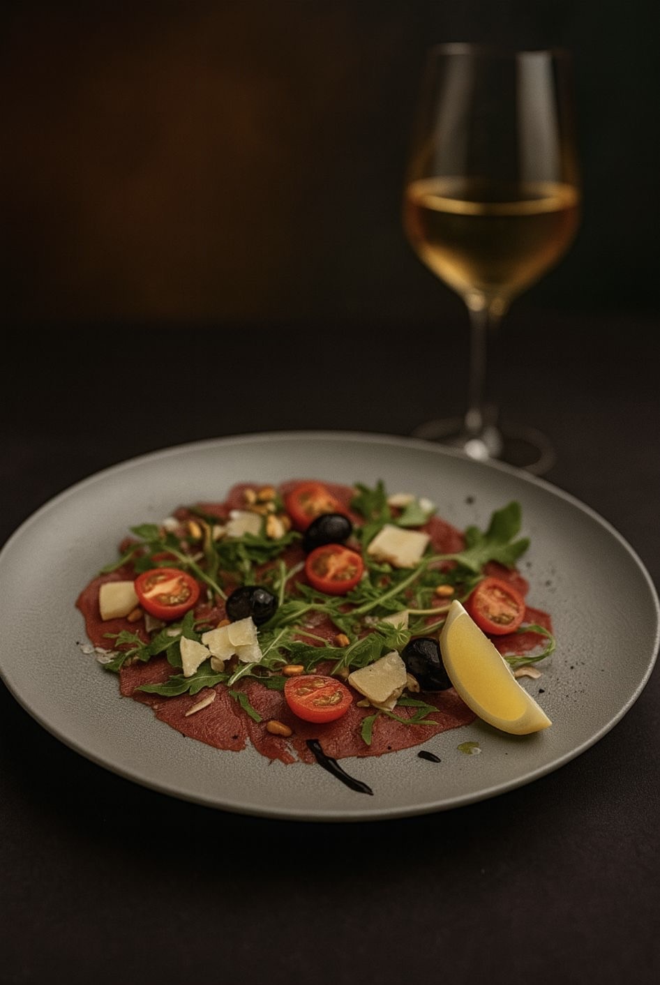 10,90 € Zartes Rinderfilet, hauchdünn aufgeschnitten, mit frischem Rucola, Parmesan und Zitronen-Olivenöl