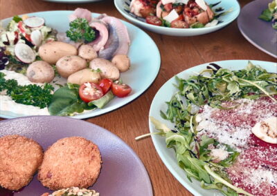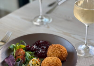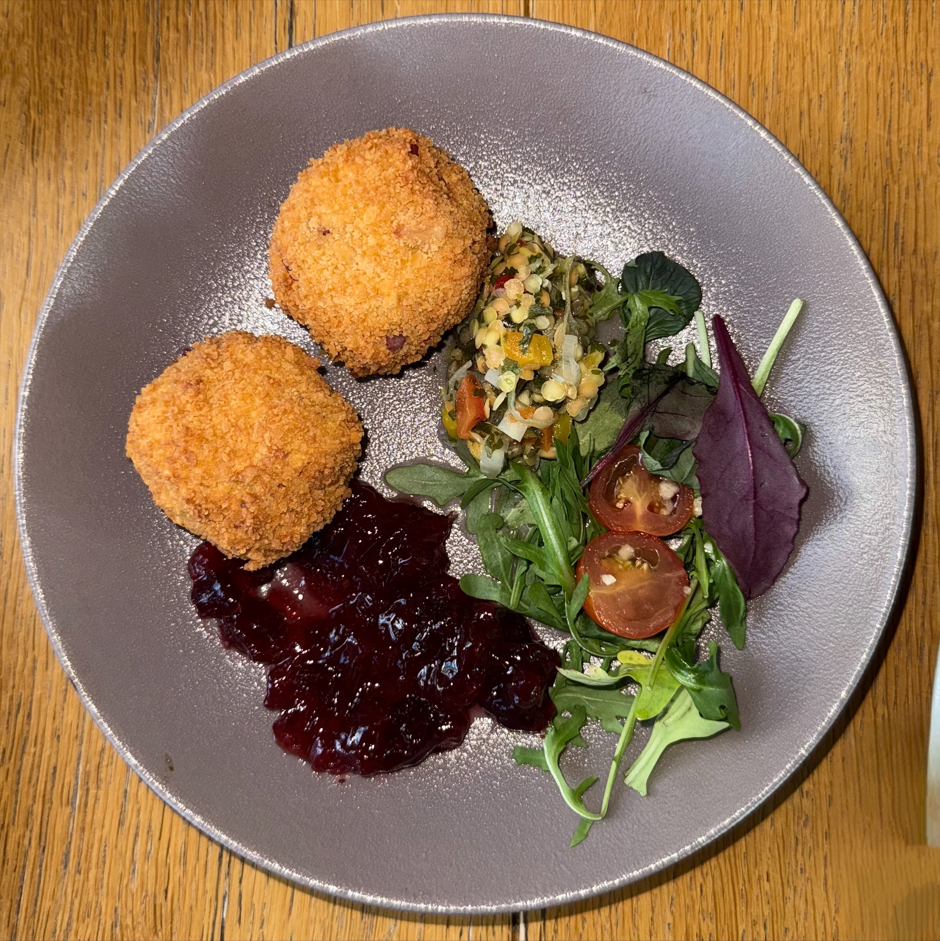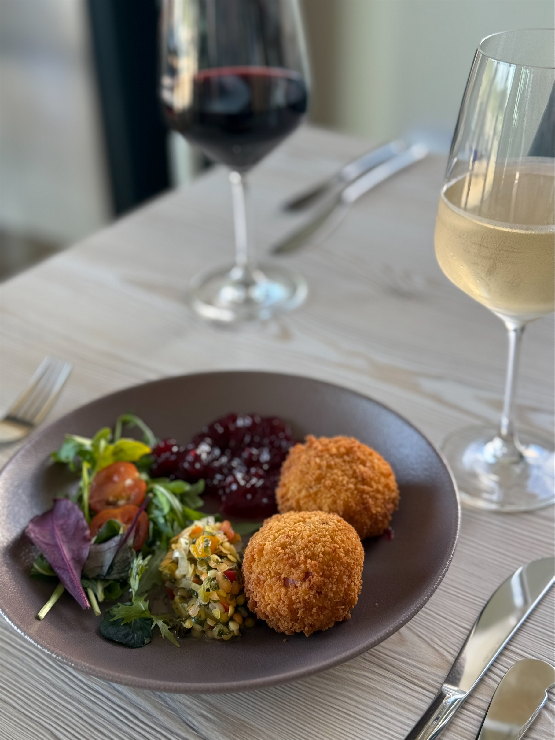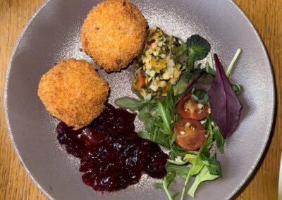 8,70 € Warm servierter Ziegenkäse, umhüllt von Landräucherschinken, auf Rucola & Preiselbeeren