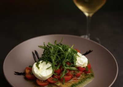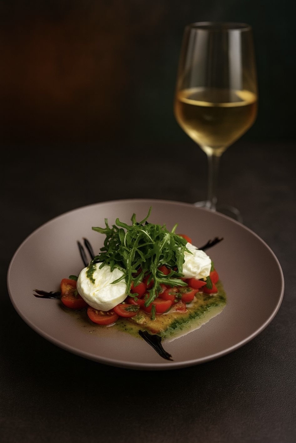 10,90 € Reife Strauchtomaten und Büffelmozzarella auf Basilikumöl, verfeinert mit Balsamico-Reduktion